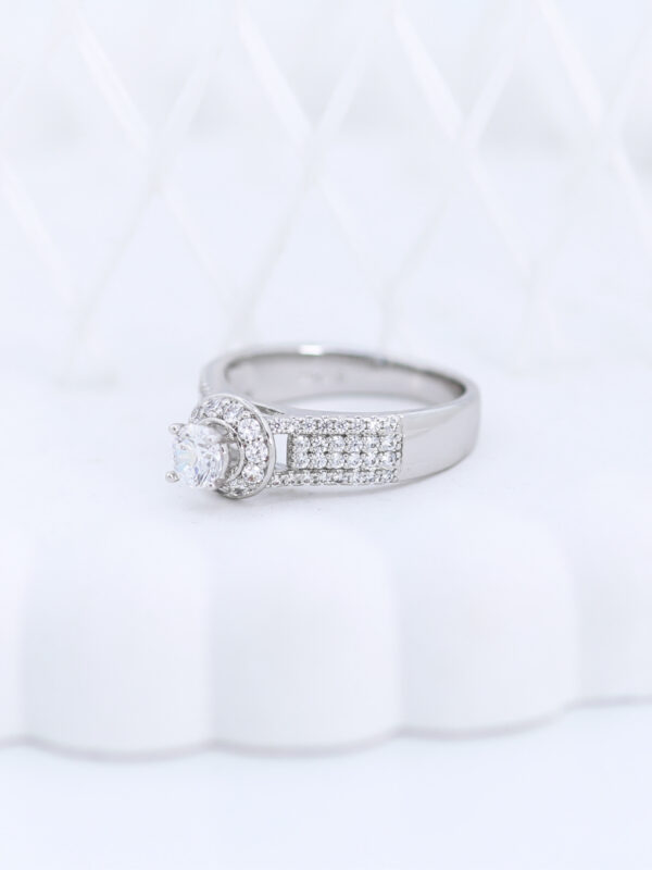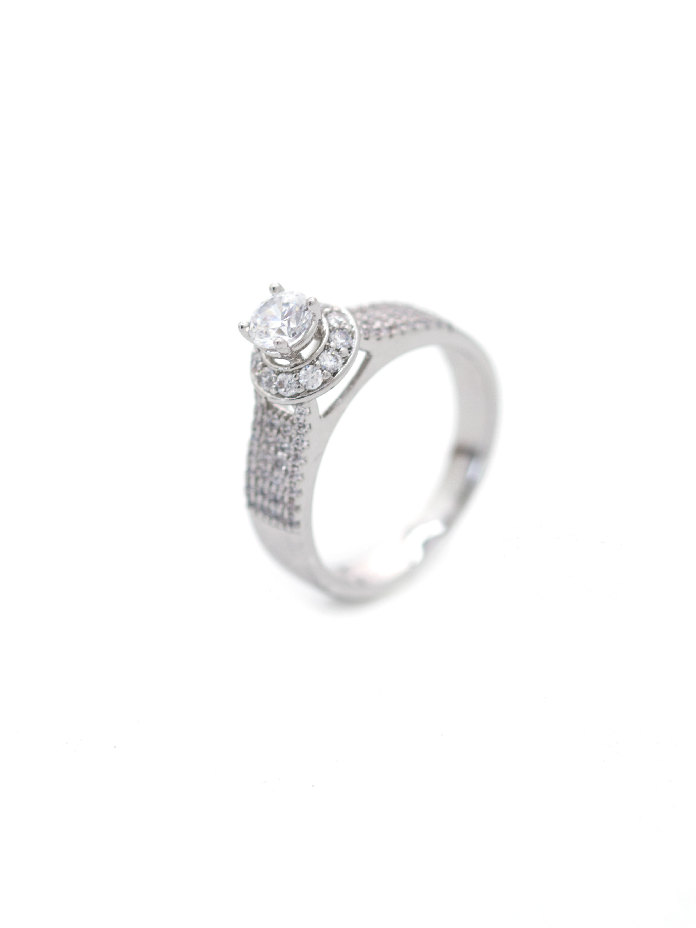 Élégante bague de fiançailles en argent, ornée d’une pierre centrale et pavée de zircons sur les côtés. Raffinée, brillante et hypoallergénique, parfaite pour un moment inoubliable.