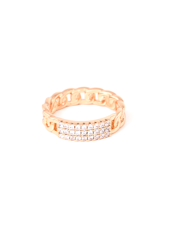 Design: Anneau composé de maillons dorés façon chaîne gourmette, avec une section frontale entièrement pavée de zircons. Le contraste entre les maillons et la surface brillante crée un look chic et affirmé.