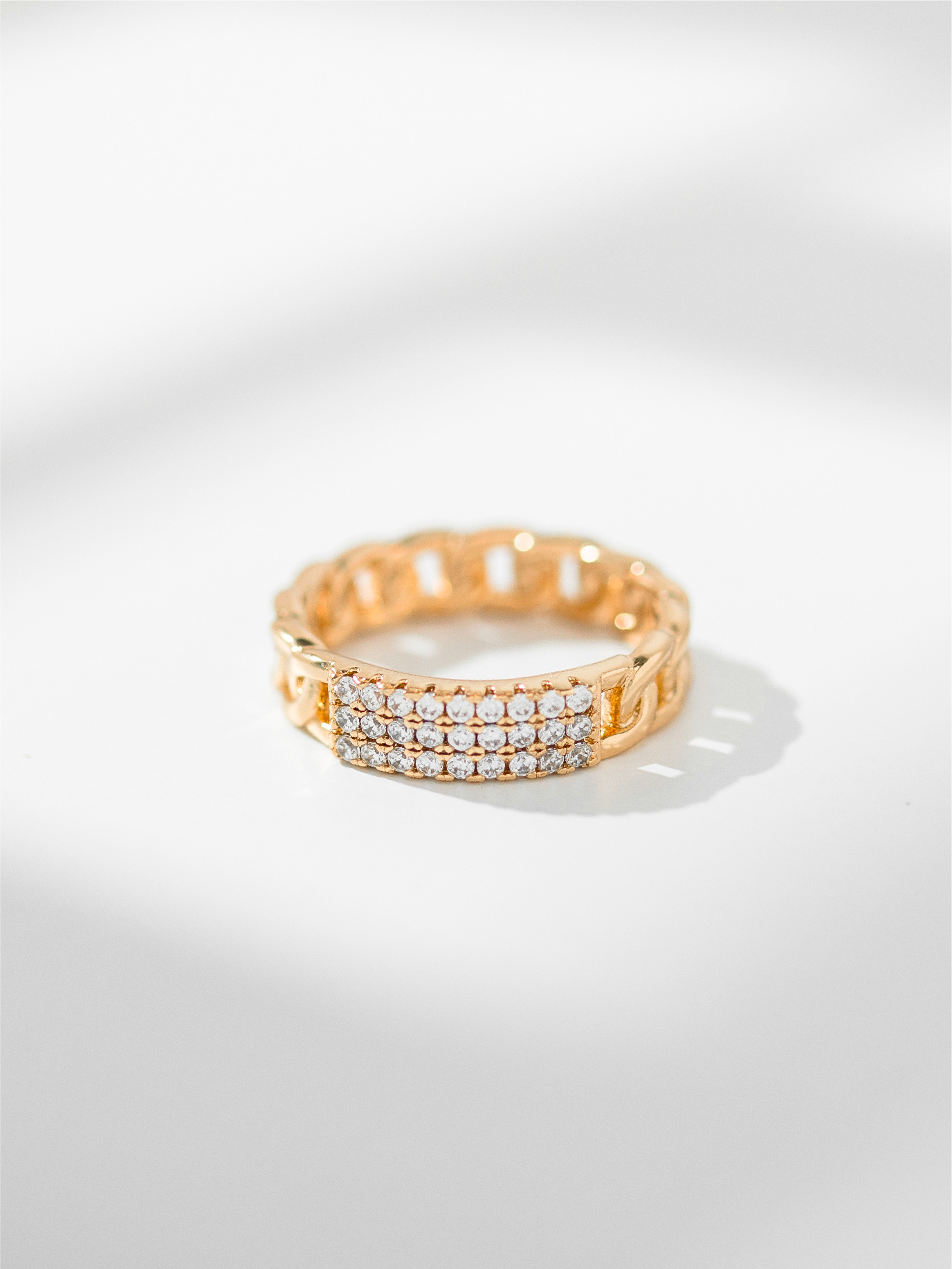 Bague dorée à maillons façon chaîne, sublimée par une bande pavée de zircons. Un design moderne, tendance et lumineux pour un style audacieux et élégant.
