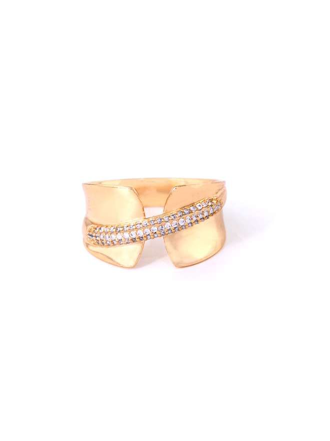 Bague dorée au design ruban croisé, sublimée par une ligne de zircons délicats. Un bijou moderne et lumineux qui ajoute une touche chic à chaque look.