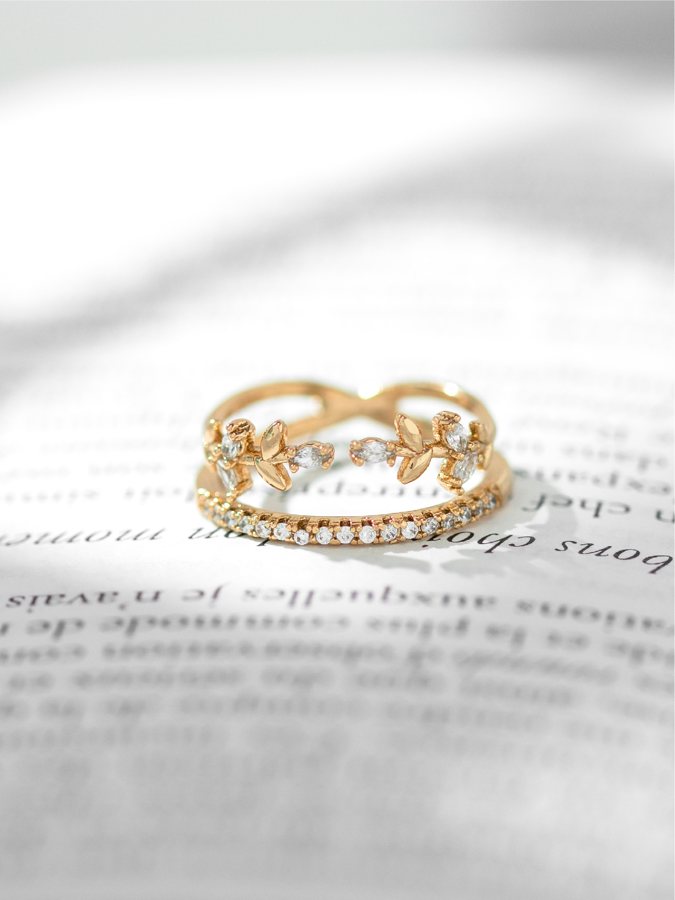 Design: Structure double anneau doré reliée par un motif de feuilles finement travaillées, serties de zircons pour un éclat naturel. Le style évoque la délicatesse botanique et offre une allure romantique et moderne.