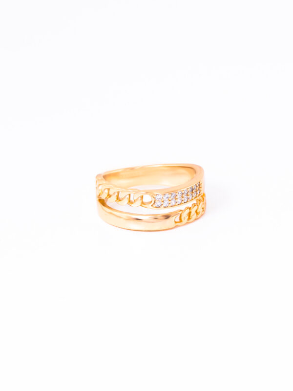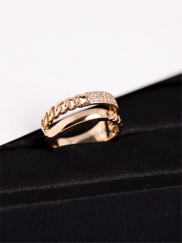 Design : Bague double anneau lisse pour femme avec nœuds, chaînes et zircons – style moderne et raffiné