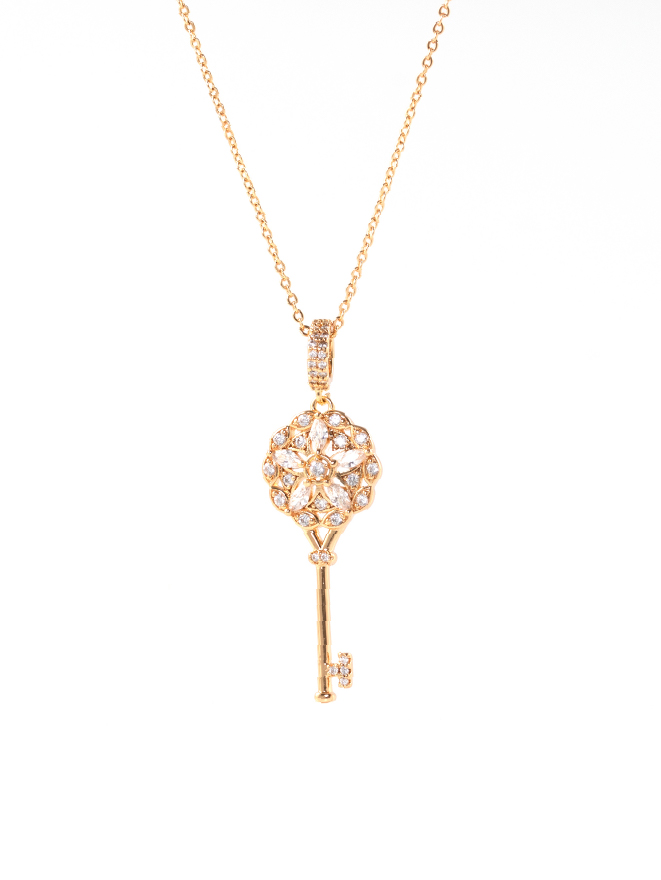 Design : Pendentif en forme de clé couleur or serti de zircon brillant, suspendu à une chaîne fine pour un rendu chic et intemporel.