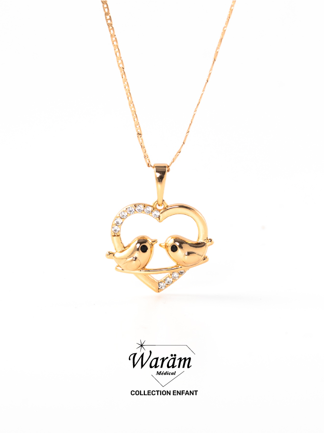 Découvrez le Collier Cœur Oiseaux Doré, bijou enfant hypoallergénique, élégant et sûr pour un usage quotidien. Parfait comme cadeau poétique.